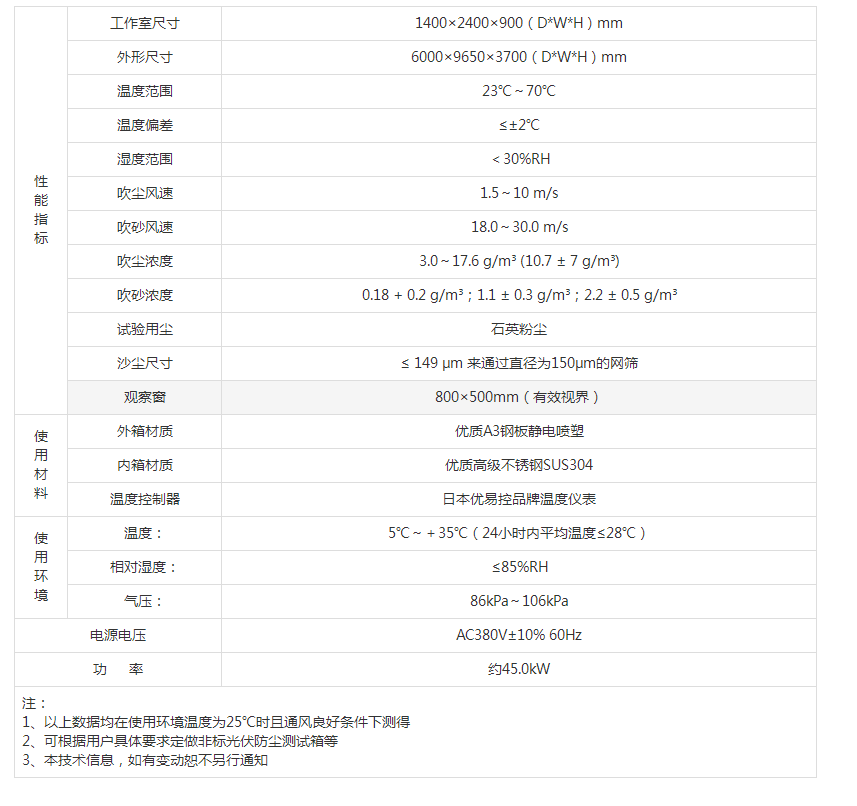 注: 1、以上數(shù)據(jù)均在使用環(huán)境溫度為25℃時且通風(fēng)良好條件下測得 2、可根據(jù)用戶具體要求定做非標光伏防塵測試箱等 3、本技術(shù)信息,如有變動恕不另行通知 |