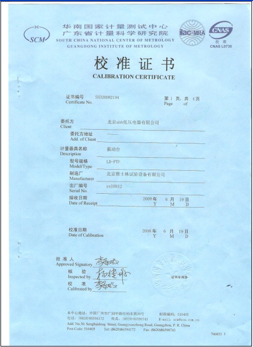 >>振動試驗臺校準證書-廣東計量院-ABB集團