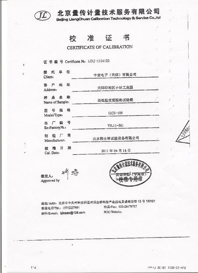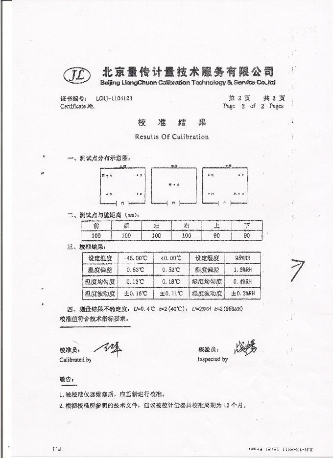 高低溫交變濕熱試驗(yàn)箱校準(zhǔn)證書(shū)-北京量傳計(jì)量-中安電子