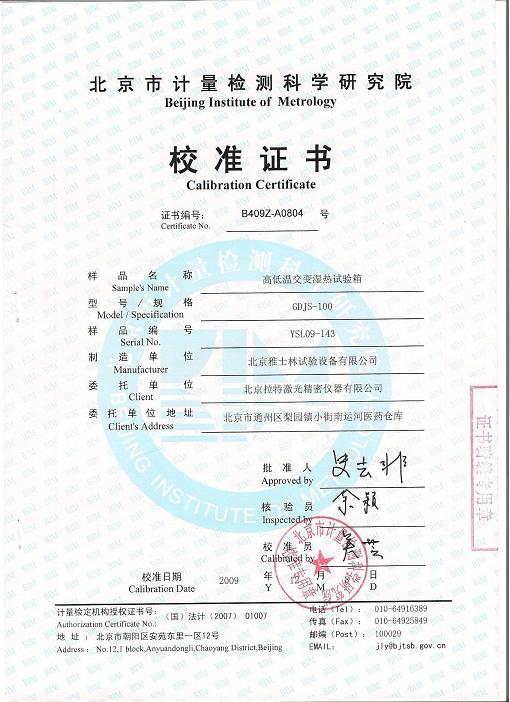 >>高低溫交變濕熱試驗(yàn)箱校準(zhǔn)證書-北京計量院-拉特激光