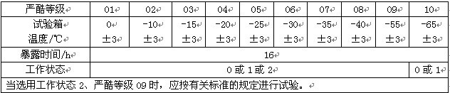 恒溫恒濕試驗箱試樣在恒應(yīng)力狀態(tài)暴露期間,溫度變化應(yīng)十分緩慢以防止試樣損壞。用條件試驗方法11或12時,溫度變化階段應(yīng)保持最大的相對濕度,并在有關(guān)標(biāo)準(zhǔn)中說明試樣上是否允許出現(xiàn)凝露。恒溫恒濕試驗箱適用于航空航天產(chǎn)品、信息電子儀器儀表、材料、電工、電子產(chǎn)品、各種電子元氣件在高低溫或濕熱環(huán)境下、檢驗其各性能項指標(biāo)。 條件試驗10方法:低溫(下圖為條件試驗方法10低溫的嚴(yán)酷等級表)