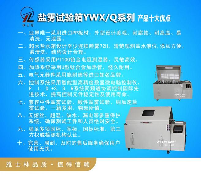 鹽霧腐蝕試驗箱為人工氣候環(huán)境“三防”(濕熱、鹽霧、霉菌)試驗設(shè)備之一,是模擬大氣中含鹽微小液滴所構(gòu)成的彌散系統(tǒng)的設(shè)備。廣泛應(yīng)用在電子、電工及汽車、摩托車、五金工具、化工等產(chǎn)品及零部件、金屬材料與制品的鍍、涂層等進行鹽霧試驗。市場規(guī)模巨大,競爭空前,雅士林YASELINE系列鹽霧試驗箱高起點、高質(zhì)量、高服務(wù),定位于中高端客戶群體,以其過硬的質(zhì)量和完善的售后服務(wù)及良好的市場口碑贏得了中國航天、中國科學(xué)院、清華大學(xué)、北航、摩托羅拉、ABB、西門子、豐田汽車、中國船舶、北京現(xiàn)代汽車等一系列高端客戶群,其產(chǎn)品具有如下十大優(yōu)點: