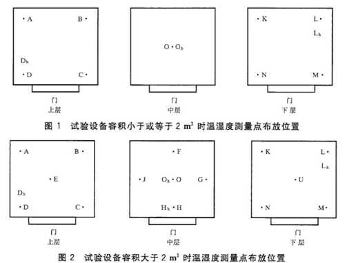 恒溫恒濕試驗(yàn)箱濕度測量儀器采用干濕球溫度計(jì)或由其他濕度傳感器組成的濕度測量系統(tǒng),其測量結(jié)果的擴(kuò)展不確定度不大于被測溫度允許偏差的1/3。 恒溫恒濕試驗(yàn)箱濕度測量點(diǎn)數(shù)量及位置要求: 一,根據(jù)試驗(yàn)設(shè)備容積的大小,將工作空間分為上、中、下三層,中層通過工作空間幾何中心點(diǎn),將一定數(shù)量的相對濕度傳感器布放在其中規(guī)定的位置上,傳感器不應(yīng)受冷熱源的直接輻射。 二、相對濕度測量點(diǎn)用Oh、Dh、Hh、Lh表示。Oh位于中層的幾何心心,其他各測量點(diǎn)與試驗(yàn)設(shè)備內(nèi)壁的距離為各自邊長的1/10,但最大距離不大于500mm,最小距離不小于50mm。 三、恒溫恒濕試驗(yàn)箱容積小于或等于2m3時(shí),相對濕度測量點(diǎn)為3個(gè),如圖1所示。試驗(yàn)箱容積大于2m3時(shí),相對濕度測量點(diǎn)為4個(gè),如圖2所示。當(dāng)試驗(yàn)箱容積小于0.05 m3或大于50 m3時(shí),可適當(dāng)減少或增加測量點(diǎn)。 四、每5min溫度平均變化速率測量點(diǎn)為工作空間幾何中心點(diǎn)。